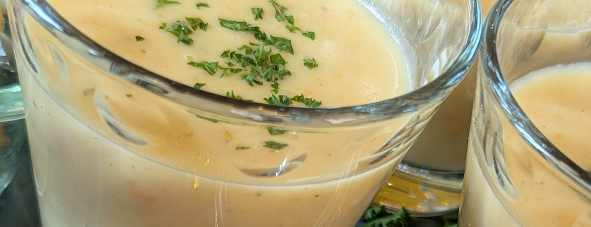 Kartoffelsuppe im Pfälzer Dubbenglas mit Speck, Croutons und Blutwurst